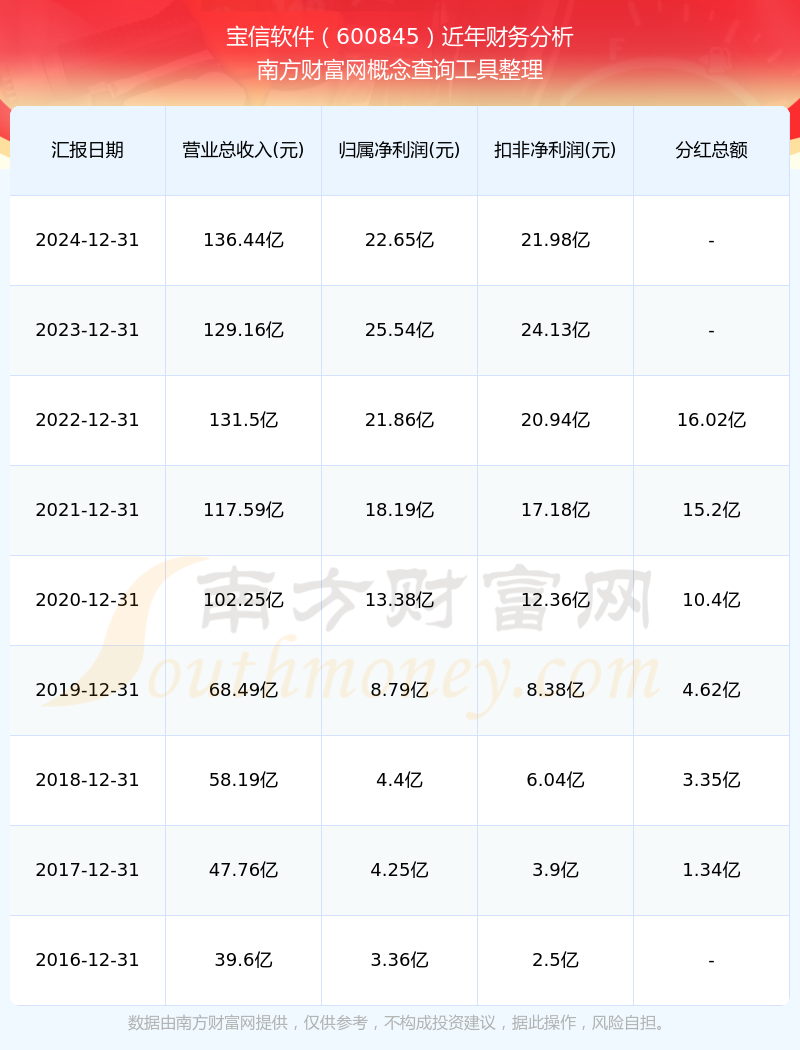 2024年宝信软件总营收136.44亿,同比增长5.64%;净利润22.65亿,同比增长-11.28%;销售毛利率34.77%。