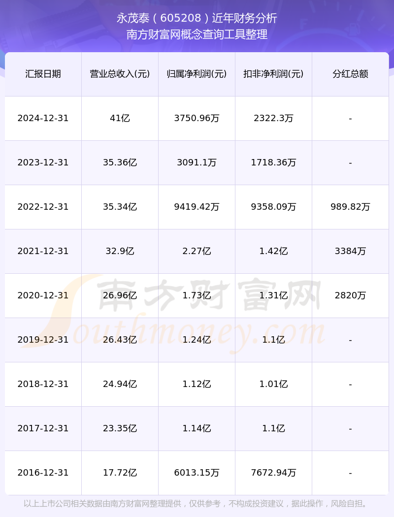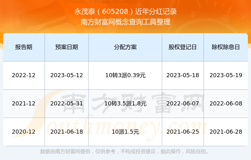 永茂泰最新一次公布的分红方案为10转3派0.39元。本次权益分派股权登记日为2023年5月18日,除权除息日为2023年5月19日,派息日为2023年5月19日。