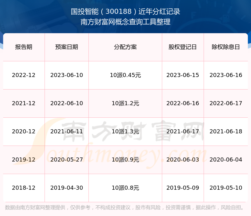 国投智能最新一次公布的分红方案为10派0.45元。本次权益分派股权登记日为2023年6月15日,除权除息日为2023年6月16日,派息日为2023年6月16日。