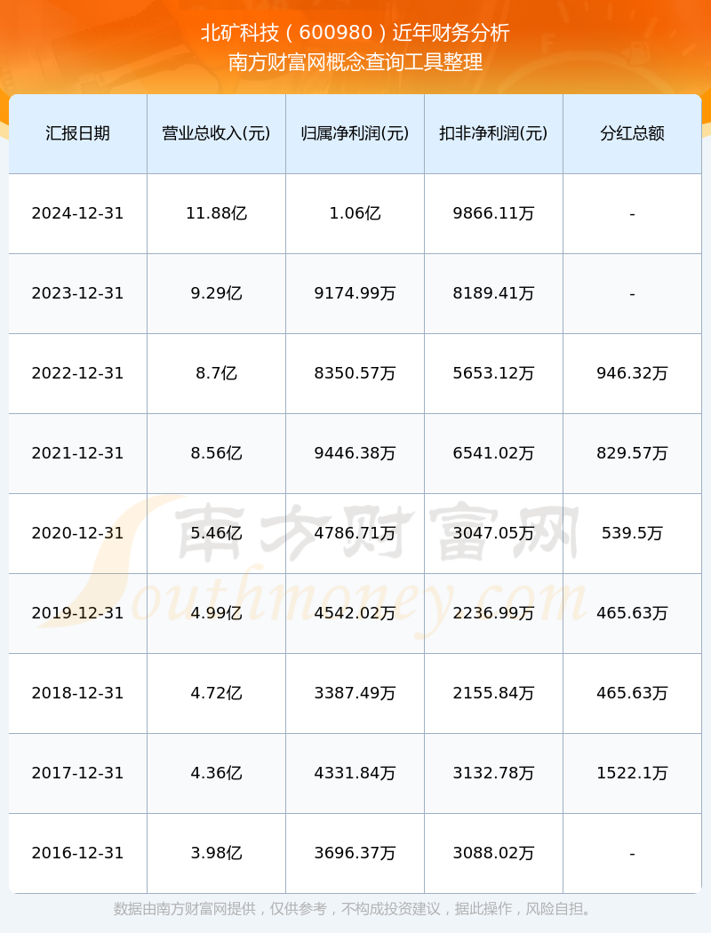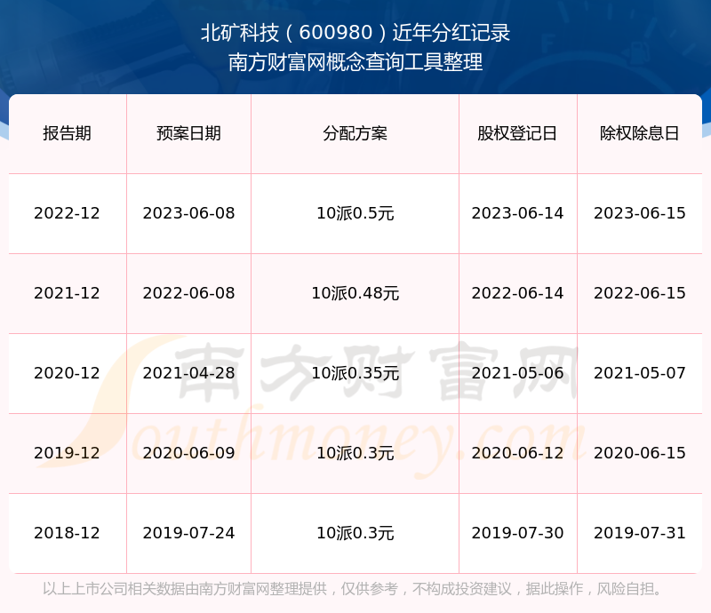 北矿科技最新一次公布的分红方案为10派0.5元。本次权益分派股权登记日为2023年6月14日,除权除息日为2023年6月15日,派息日为2023年6月15日。