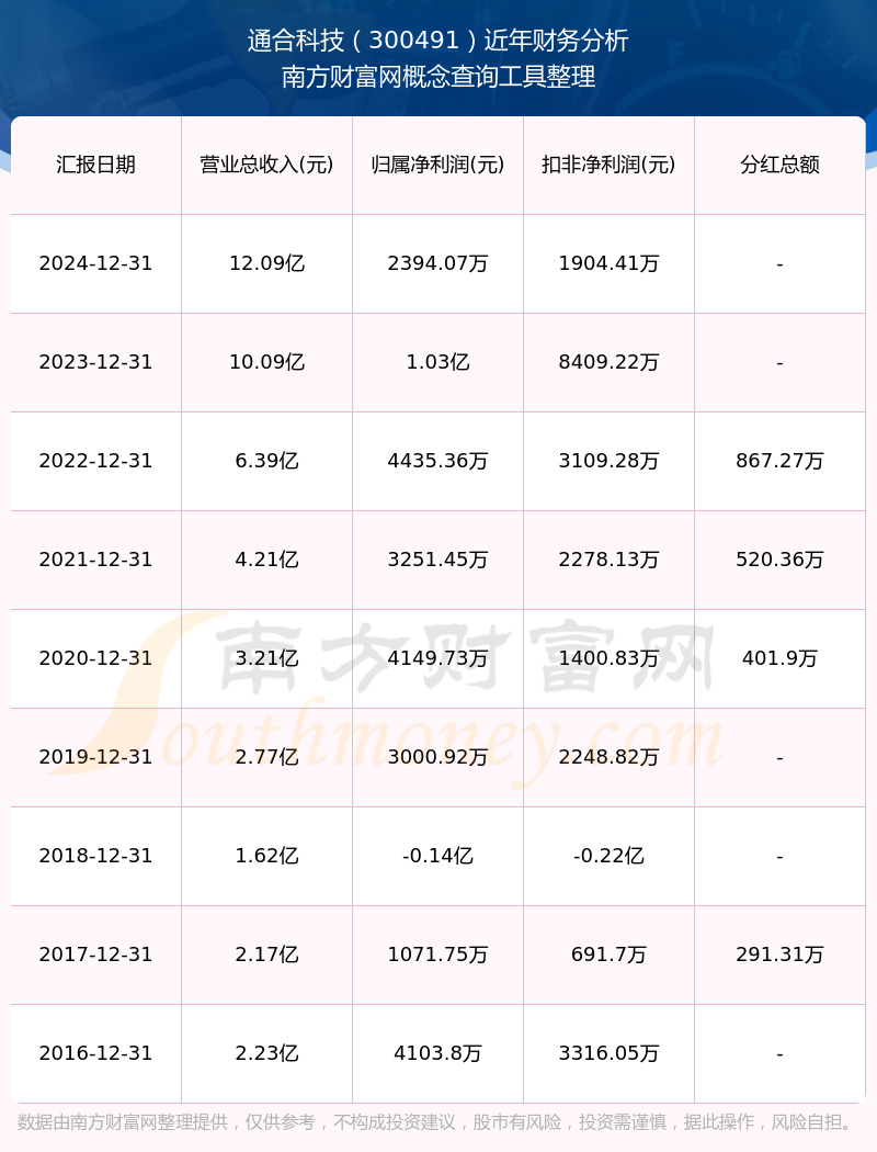 2024年通合科技总营收12.09亿,同比增长19.89%;净利润2394.07万,同比增长-76.66%;销售毛利率27.25%。
