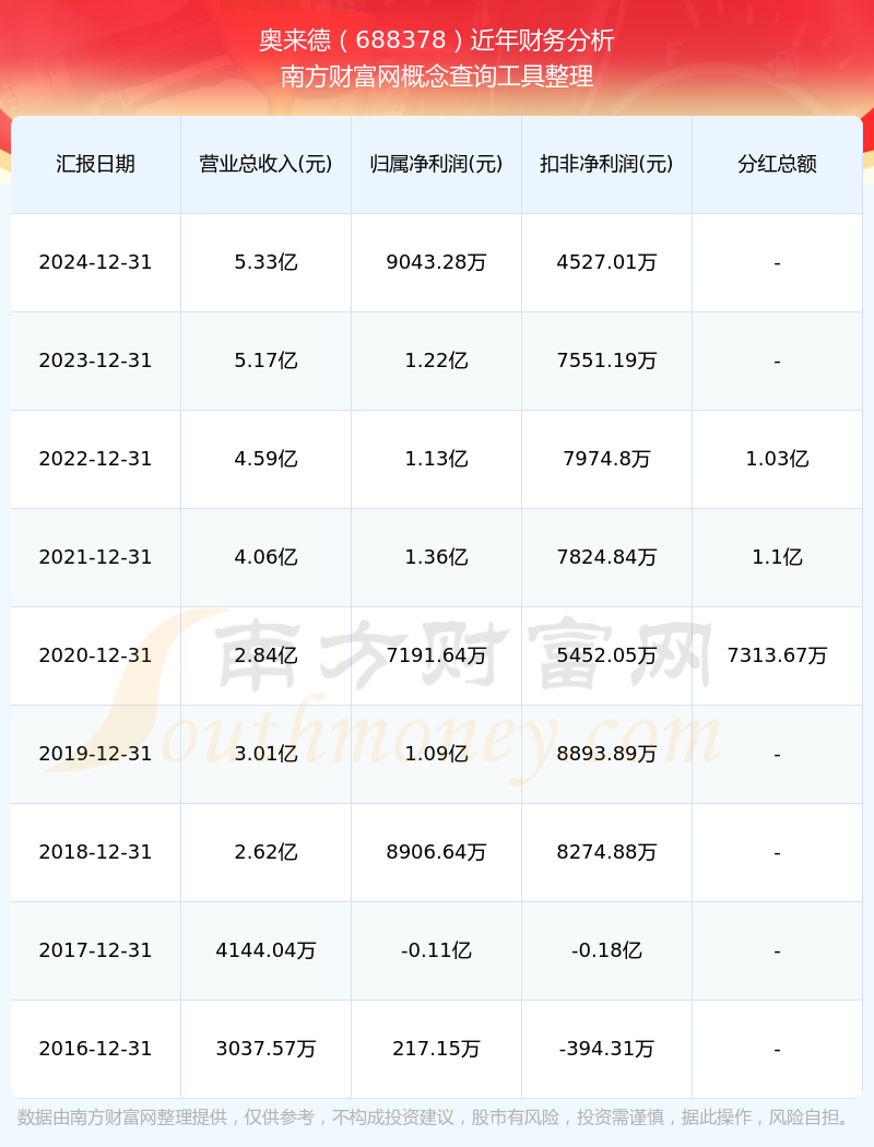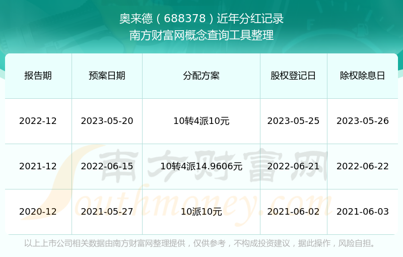 奥来德最新一次公布的分红方案为10转4派10元。本次权益分派股权登记日为2023年5月25日,除权除息日为2023年5月26日,派息日为2023年5月26日。