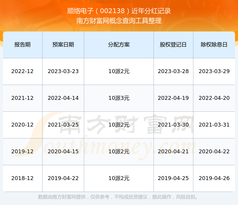 顺络电子最新一次公布的分红方案为10派2元。本次权益分派股权登记日为2023年3月28日,除权除息日为2023年3月29日,派息日为2023年3月29日。