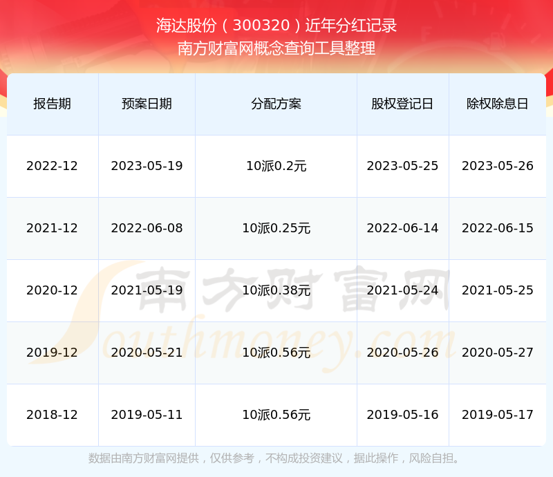海达股份最新一次公布的分红方案:10派0.2元。