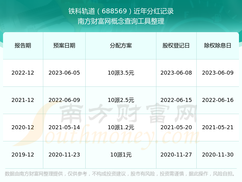 铁科轨道最新一次公布的分红方案为10派3.5元。本次权益分派股权登记日为2023年6月8日,除权除息日为2023年6月9日,派息日为2023年6月9日。