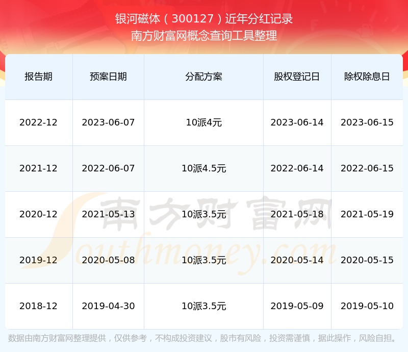 银河磁体最新一次公布的分红方案为10派4元。本次权益分派股权登记日为2023年6月14日,除权除息日为2023年6月15日,派息日为2023年6月15日。