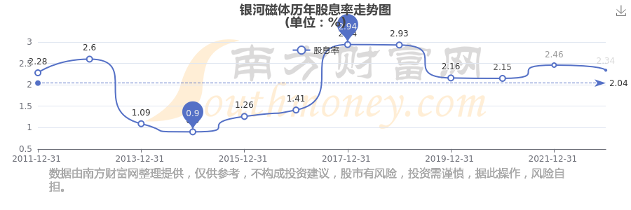 银河磁体历年股息率走势如下图: