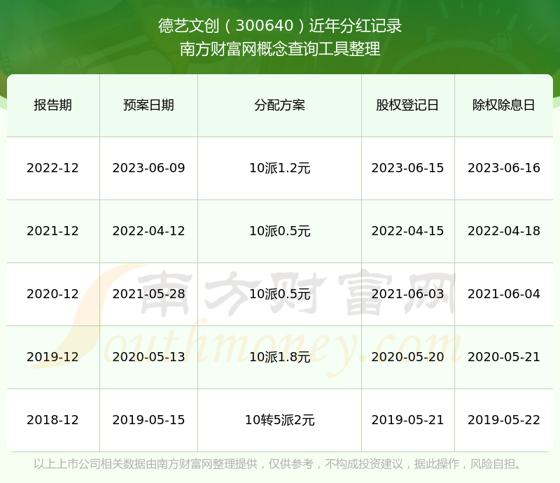 德艺文创最新一次公布的分红方案为10派1.2元。本次权益分派股权登记日为2023年6月15日,除权除息日为2023年6月16日,派息日为2023年6月16日。