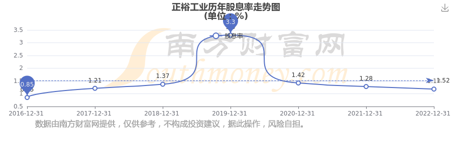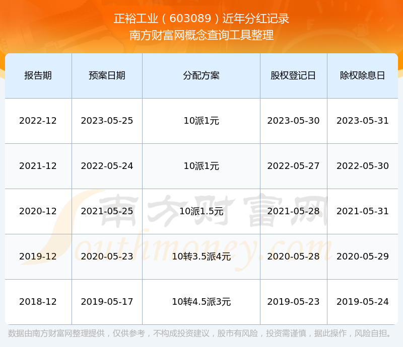 正裕工业最新一次公布的分红方案为10派1元。本次权益分派股权登记日为2023年5月30日,除权除息日为2023年5月31日,派息日为2023年5月31日。