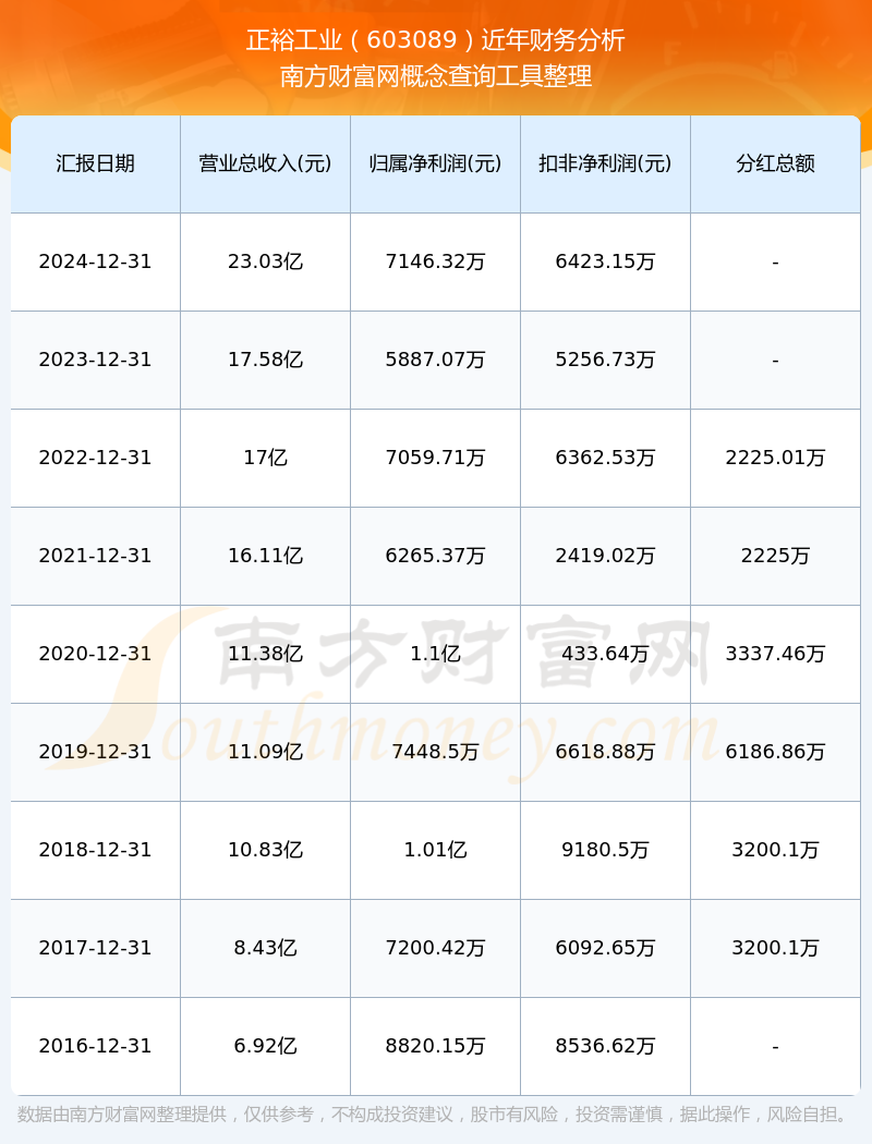 正裕工业公司2024年实现营业收入23.03亿元,同比增长30.98%;净利润7146.32万元,同比增长21.39%;毛利率24.11%。