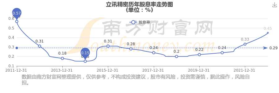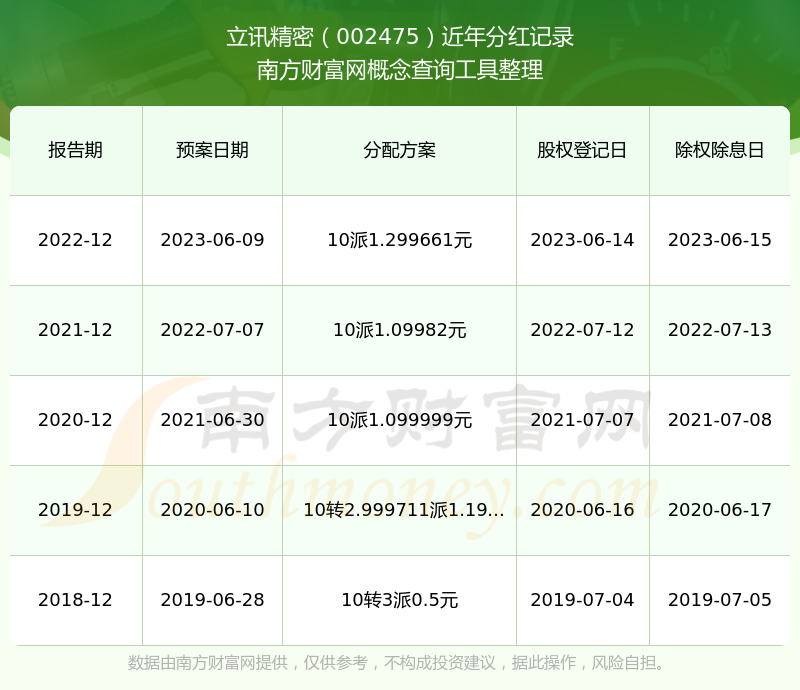 立讯精密最新一次公布的分红方案为10派1.299661元。本次权益分派股权登记日为2023年6月14日,除权除息日为2023年6月15日,派息日为2023年6月15日。