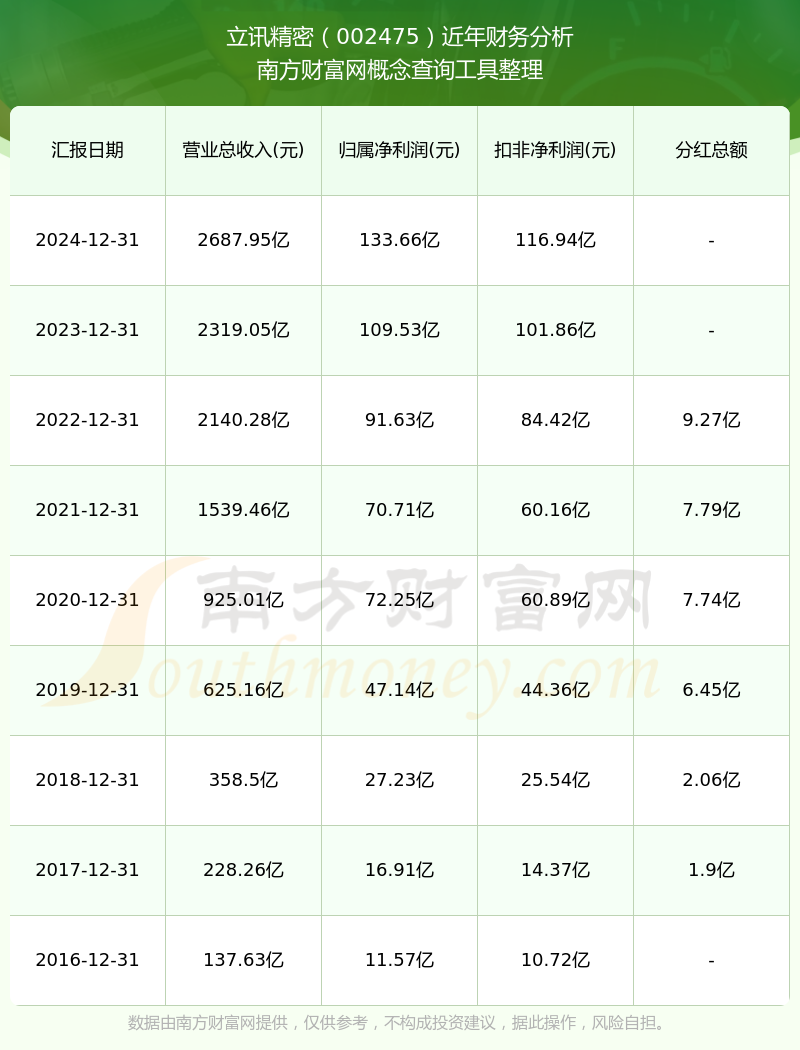 公司2024年总营收2687.95亿,同比增长15.91%;净利润133.66亿,同比增长22.03%;销售毛利率10.41%。