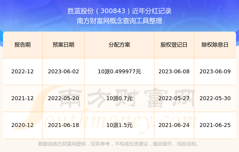胜蓝股份最新一次公布的分红方案:10派0.499977元。
