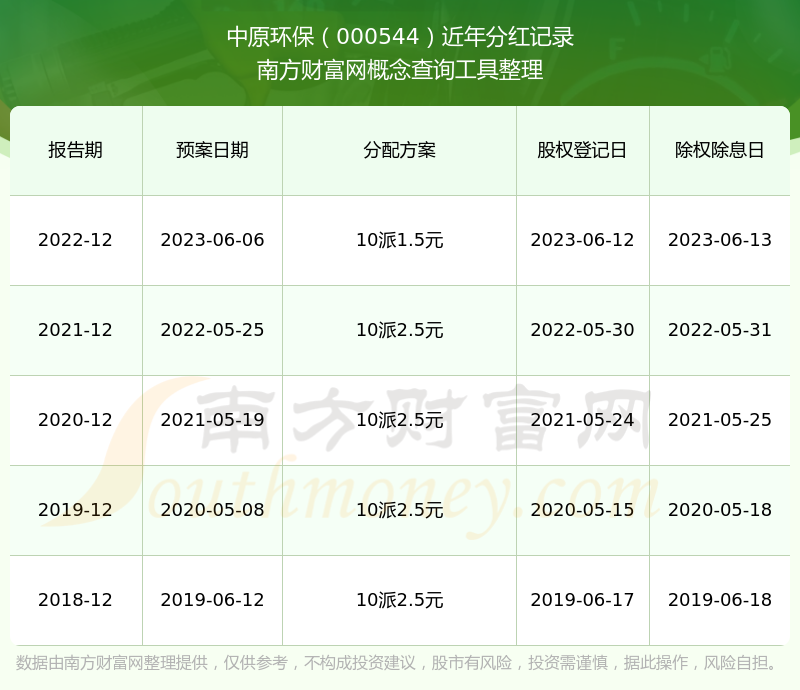 中原环保最新一次公布的分红方案为10派1.5元。本次权益分派股权登记日为2023年6月12日,除权除息日为2023年6月13日,派息日为2023年6月13日。