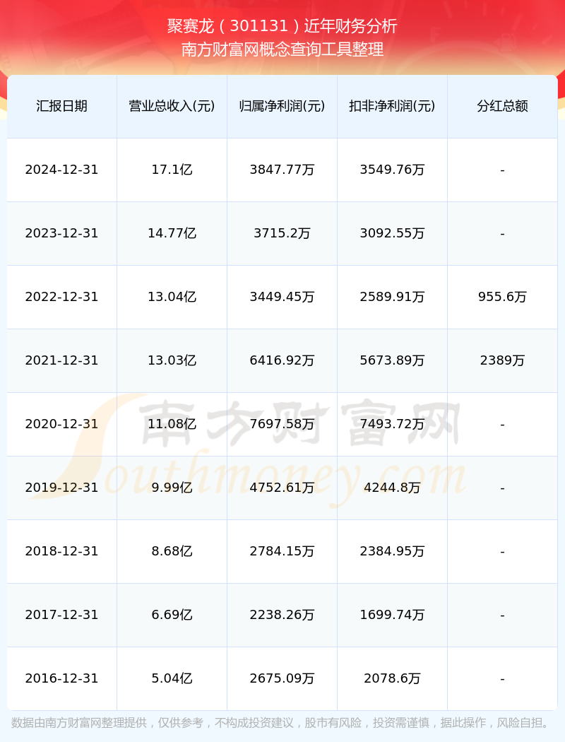 2024年报显示,聚赛龙实现营收17.1亿,同比增长15.74%;净利润3847.77万,同比增长3.57%;毛利率9.94%。
