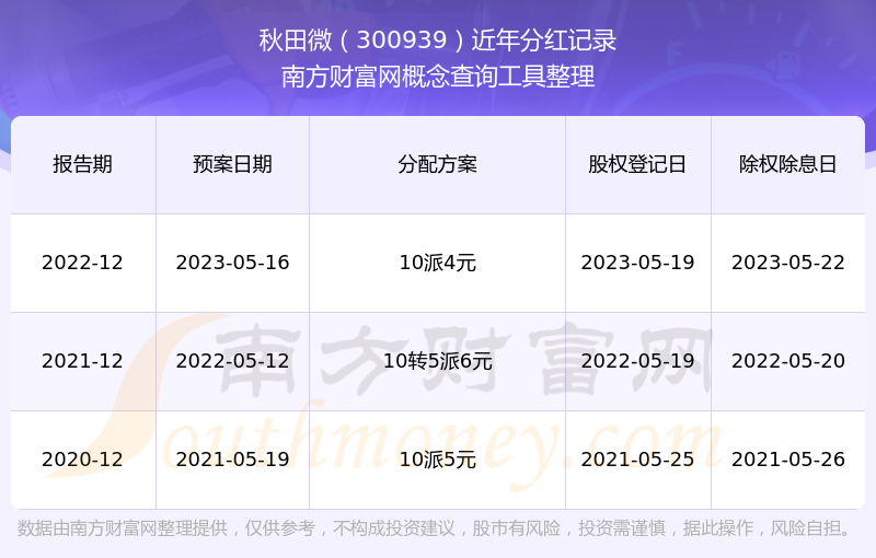 秋田微最新一次公布的分红方案为10派4元。本次权益分派股权登记日为2023年5月19日,除权除息日为2023年5月22日,派息日为2023年5月22日。