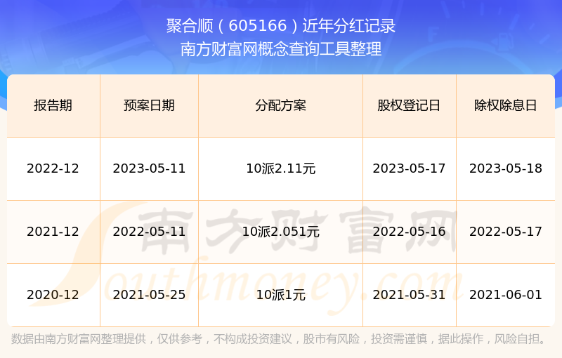 聚合顺最新一次公布的分红方案为10派2.11元。本次权益分派股权登记日为2023年5月17日,除权除息日为2023年5月18日,派息日为2023年5月18日。