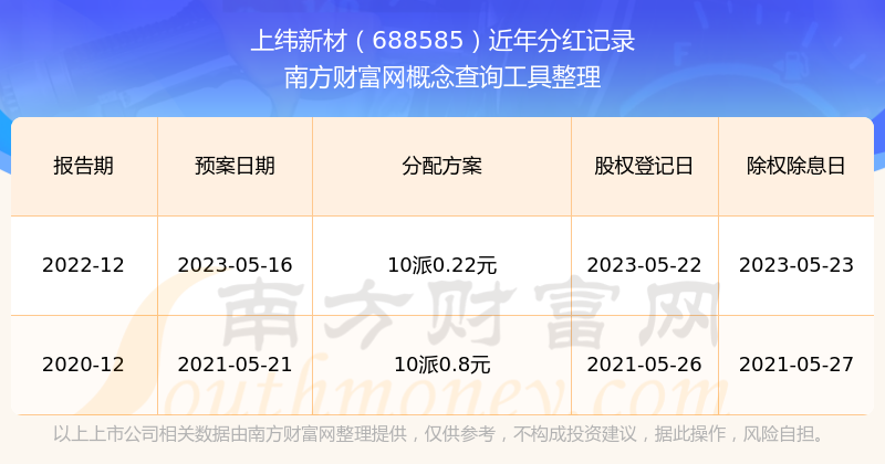 上纬新材最新一次公布的分红方案为10派0.22元。本次权益分派股权登记日为2023年5月22日,除权除息日为2023年5月23日,派息日为2023年5月23日。