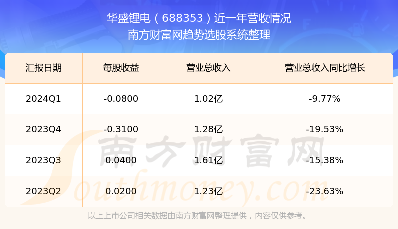 华盛锂电发布2024年第一季度财报。实现总营收1.02亿元,同比增长-9.77%;扣非净利润同比增长-918.88%至-2314.91万元。