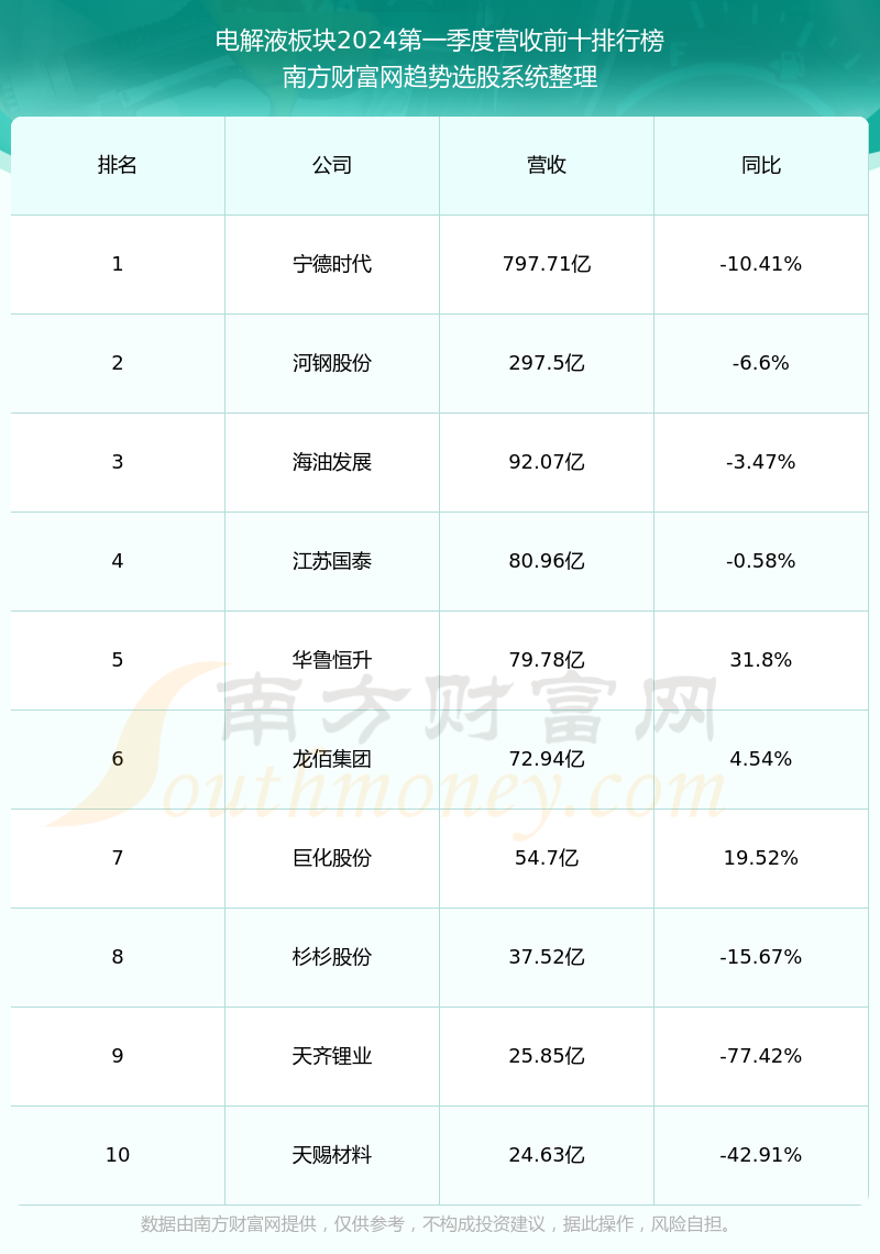 按照南方财富网趋势选股系统统计,该股所属板块为电解液板块,该板块共有40只股票,华盛锂电2024第一季度营收在该板块中排名为第40名,该板块2024第一季度营收排名前十的股票如下表: