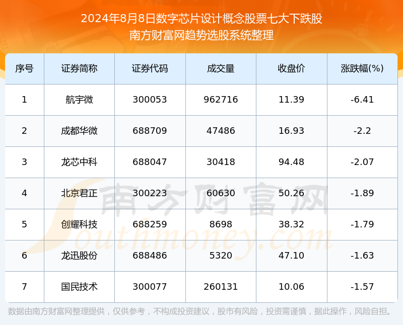 2024年8月8日盘后数据:数字芯片设计概念股票七大熊股