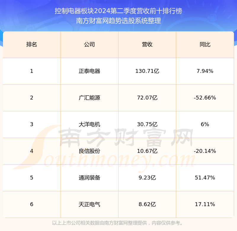按照南方财富网趋势选股系统统计,该股所属板块为控制电器板块,该板块共有6只股票,天正电气2024第二季度营收在该板块中排名为第6名,该板块2024第二季度营收排名前十的股票如下表: