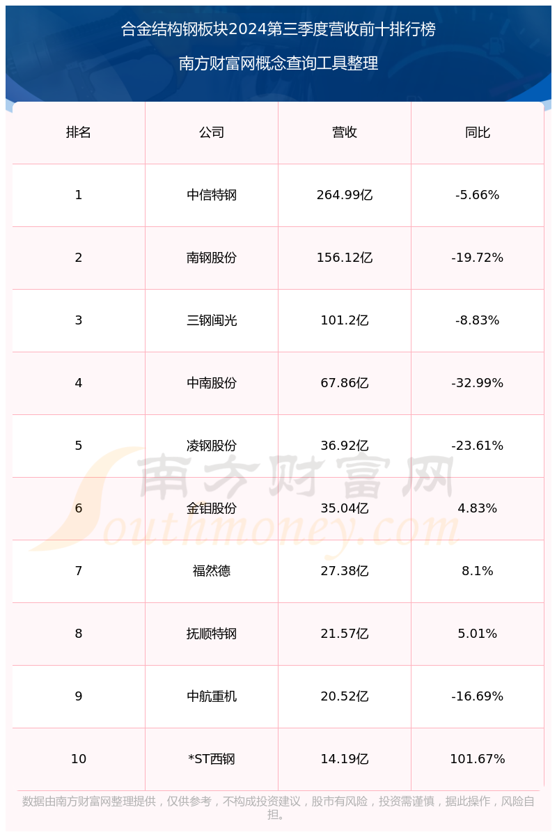 按照南方财富网概念查询工具统计,该股所属板块为合金结构钢板块,该板块共有14只股票,抚顺特钢2024第三季度营收在该板块中排名为第8名,该板块2024第三季度营收排名前十的股票如下表: