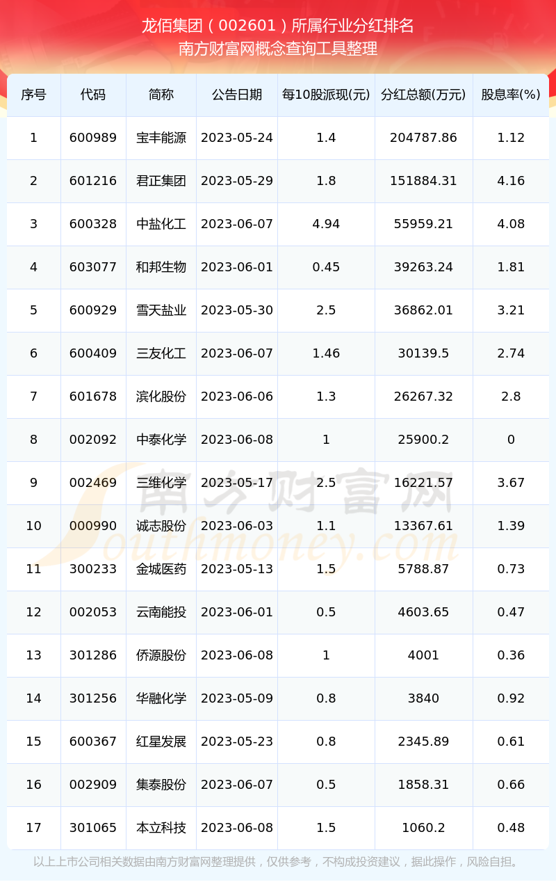 按照南方财富网趋势选股系统统计,龙佰集团所属行业为钛白粉行业,钛白粉行业分红排名情况如下表: