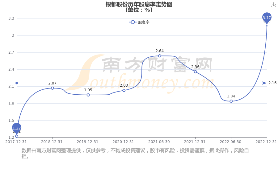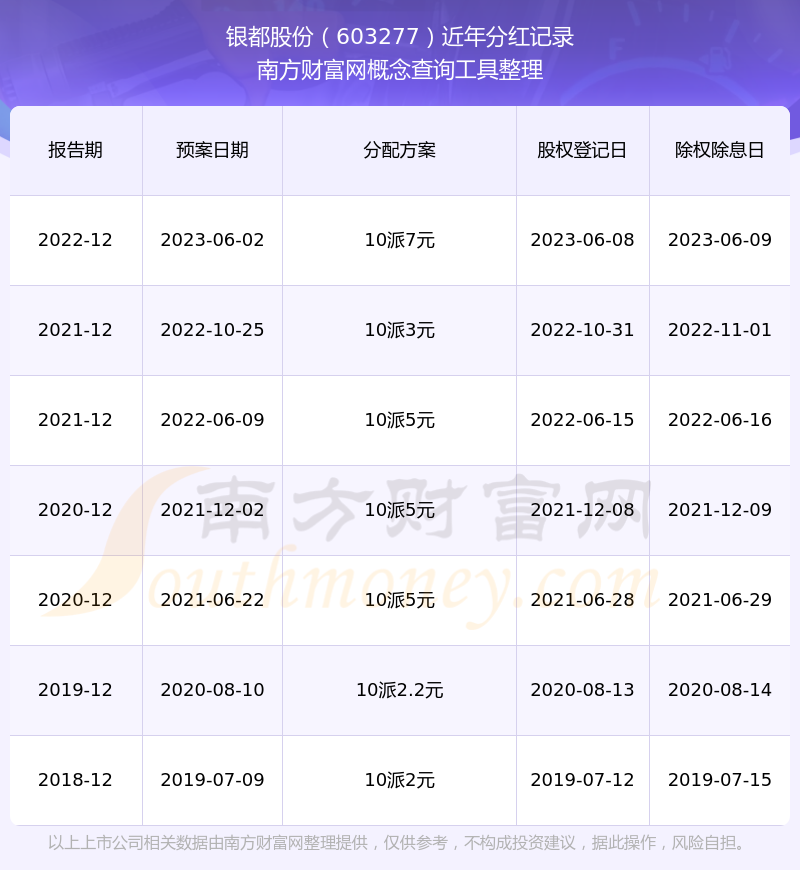 银都股份最新一次公布的分红方案为10派7元。本次权益分派股权登记日为2023年6月8日,除权除息日为2023年6月9日,派息日为2023年6月9日。