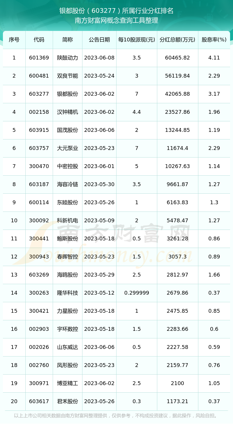 按照南方财富网趋势选股系统统计,银都股份所属行业为制冷设备行业,制冷设备行业分红排名情况如下表: