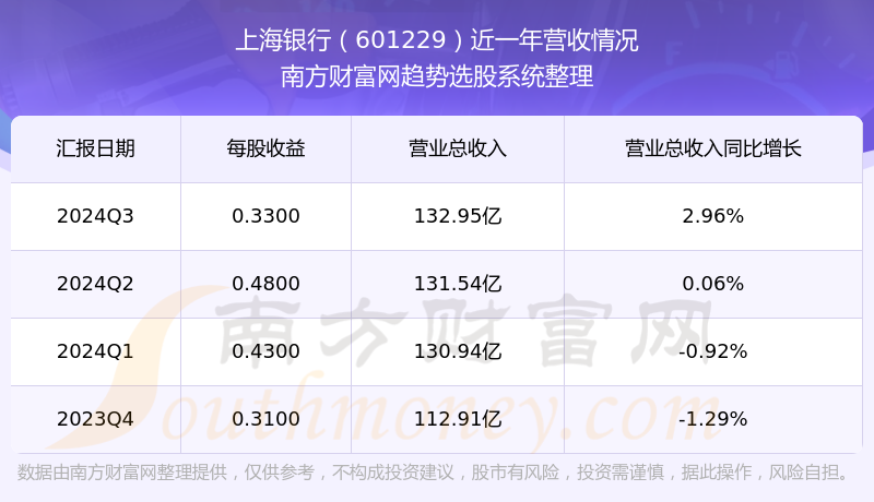 2024年第三季度,上海银行营收同比2.96%,净利润同比2.41%。