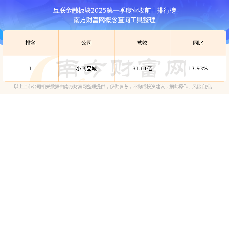 按照南方财富网概念查询工具统计,该股所属板块为互联金融板块,该板块共有1只股票,上海银行2025第一季度营收在该板块中排名为第1名,该板块2025第一季度营收排名前十的股票如下表: