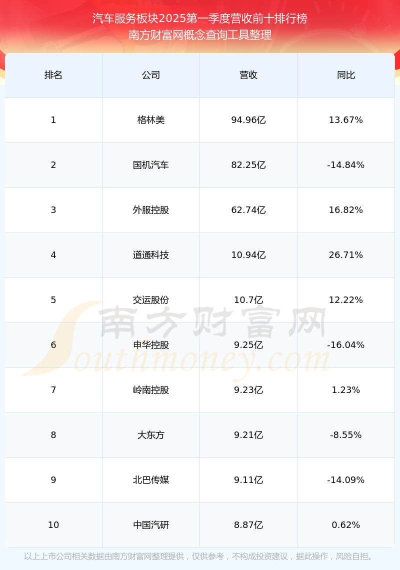 按照南方财富网概念查询工具统计,该股所属板块为汽车服务板块,该板块共有24只股票,申华控股2025第一季度营收在该板块中排名为第6名,该板块2025第一季度营收排名前十的股票如下表: