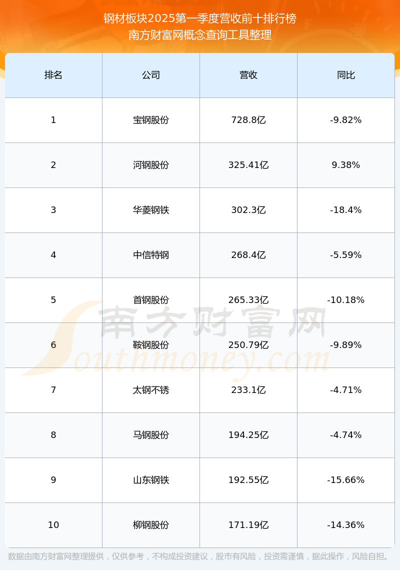 按照南方财富网概念查询工具统计,该股所属板块为钢材板块,该板块共有30只股票,安阳钢铁2025第一季度营收在该板块中排名为第17名,该板块2025第一季度营收排名前十的股票如下表: