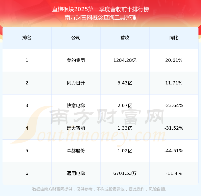 按照南方财富网概念查询工具统计,该股所属板块为直梯板块,该板块共有6只股票,梅轮电梯2025第一季度营收在该板块中排名为第6名,该板块2025第一季度营收排名前十的股票如下表:
