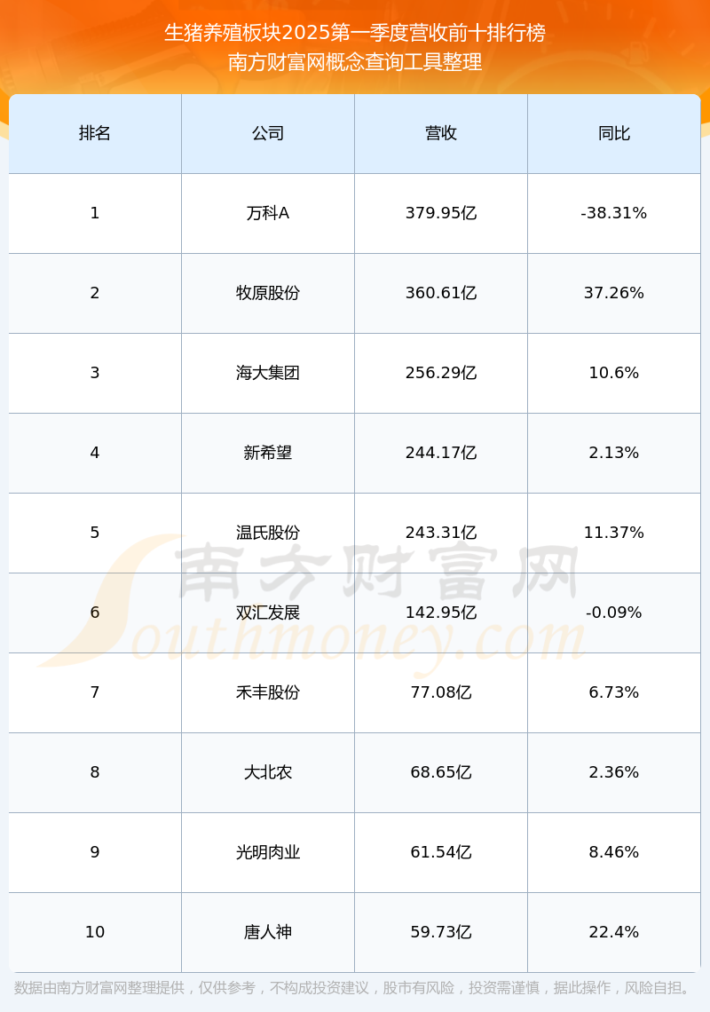 按照南方财富网概念查询工具统计,该股所属板块为生猪养殖板块,该板块共有33只股票,神农集团2025第一季度营收在该板块中排名为第21名,该板块2025第一季度营收排名前十的股票如下表: