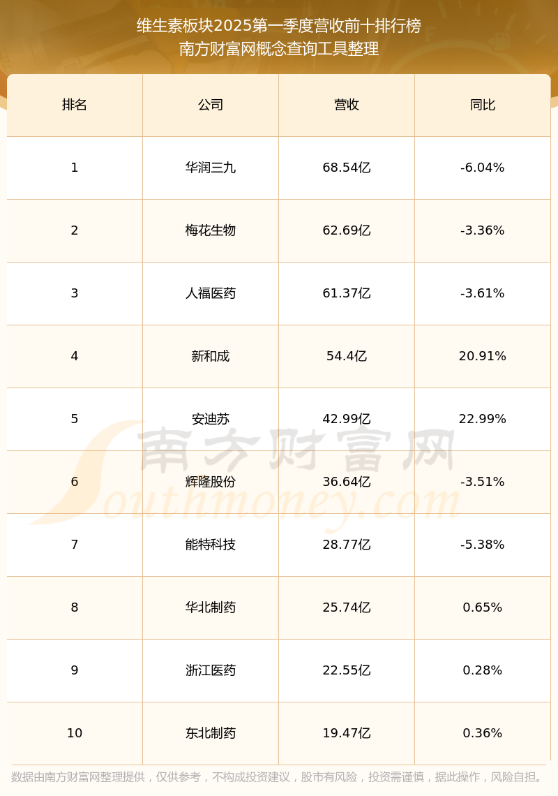 按照南方财富网概念查询工具统计,该股所属板块为维生素板块,该板块共有54只股票,梅花生物2025第一季度营收在该板块中排名为第2名,该板块2025第一季度营收排名前十的股票如下表: