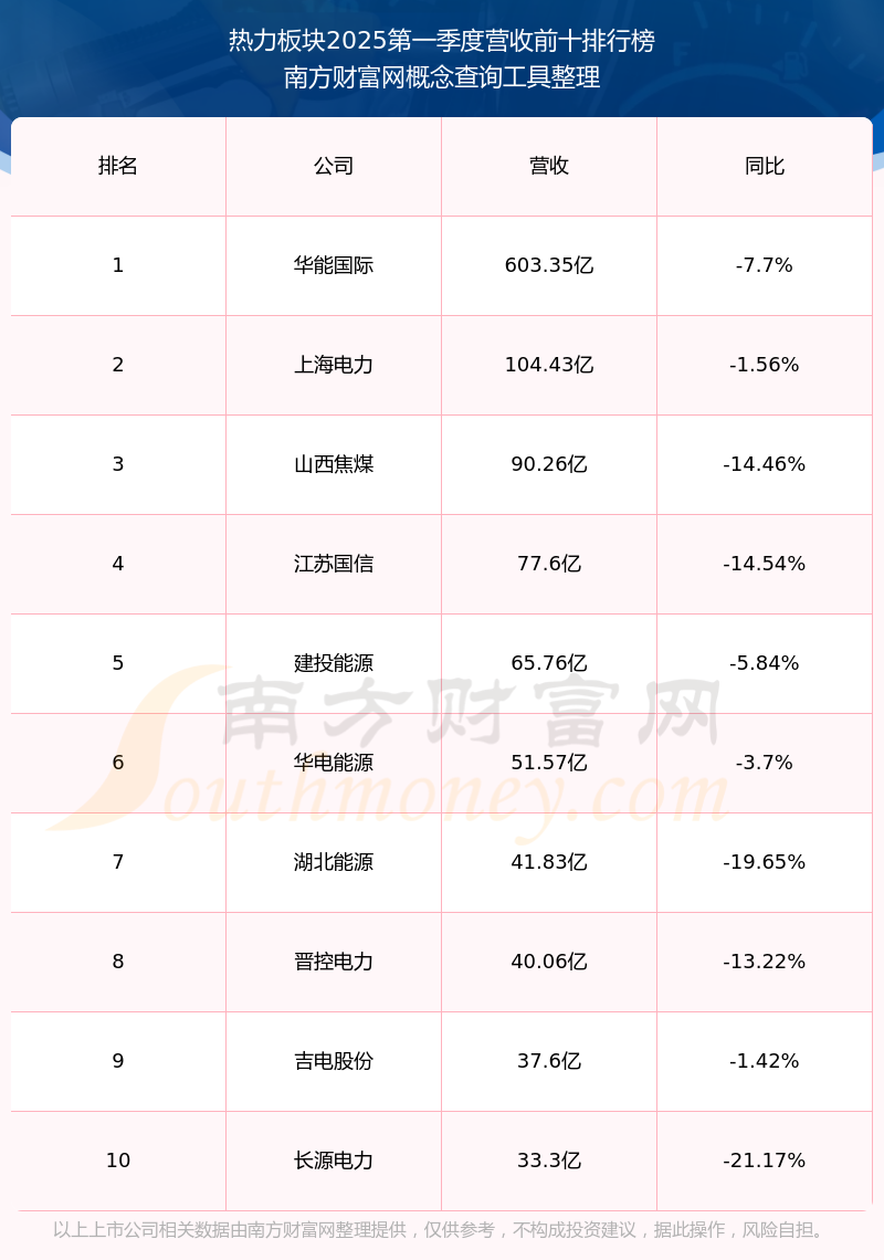 按照南方财富网概念查询工具统计,该股所属板块为热力板块,该板块共有28只股票,华能国际2025第一季度营收在该板块中排名为第1名,该板块2025第一季度营收排名前十的股票如下表: