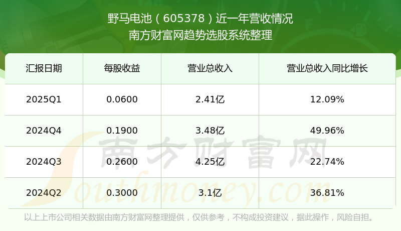 野马电池2025年第一季度财报显示,公司主营收入2.41亿元,同比12.09%;归母净利润1197.38万元,同比-50.27%;扣非净利润889.43万元,同比-58.57%;