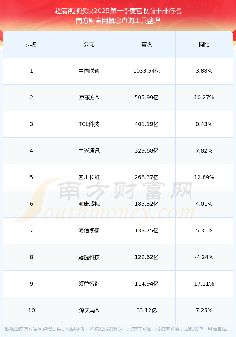 按照南方财富网概念查询工具统计,该股所属板块为超清视频板块,该板块共有101只股票,吉视传媒2025第一季度营收在该板块中排名为第52名,该板块2025第一季度营收排名前十的股票如下表: