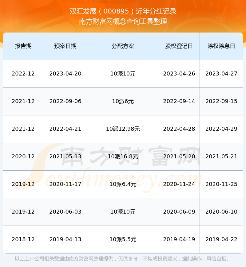 按照南方财富网趋势选股系统统计,双汇发展所属行业为生鲜行业,生鲜行业分红排名情况如下表: