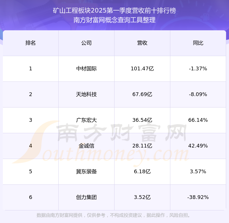 按照南方财富网概念查询工具统计,该股所属板块为矿山工程板块,该板块共有6只股票,金诚信2025第一季度营收在该板块中排名为第4名,该板块2025第一季度营收排名前十的股票如下表: