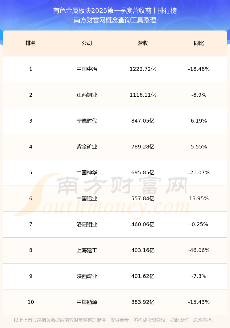 按照南方财富网概念查询工具统计,该股所属板块为有色金属板块,该板块共有289只股票,广晟有色2025第一季度营收在该板块中排名为第134名,该板块2025第一季度营收排名前十的股票如下表: