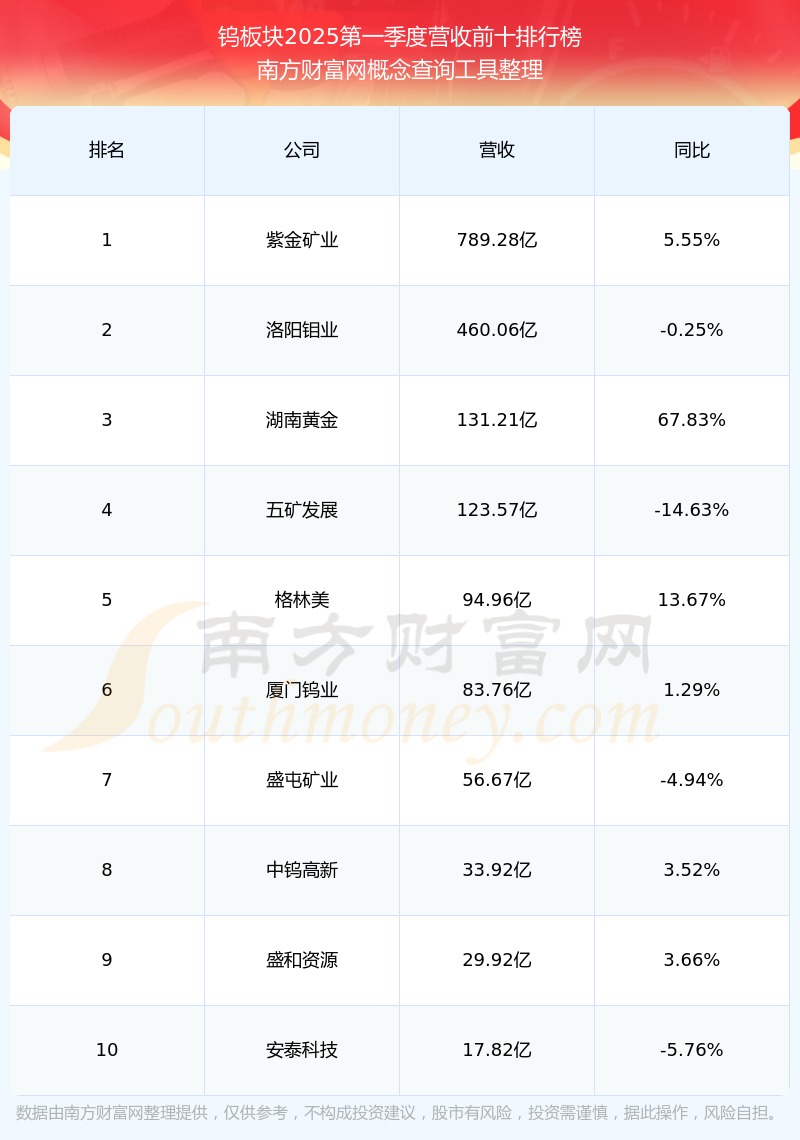 按照南方财富网概念查询工具统计,该股所属板块为钨板块,该板块共有16只股票,厦门钨业2025第一季度营收在该板块中排名为第6名,该板块2025第一季度营收排名前十的股票如下表: