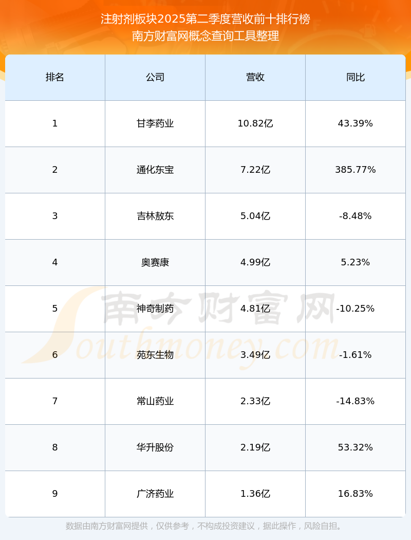 按照南方财富网概念查询工具统计,该股所属板块为注射剂板块,该板块共有9只股票,华润双鹤2025第二季度营收在该板块中排名为第9名,该板块2025第二季度营收排名前十的股票如下表: