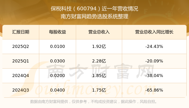 保税科技发布2025年第二季度财报。实现总营收1.92亿元,同比增长-24.43%;扣非净利润同比增长-77.87%至1328.49万元。
