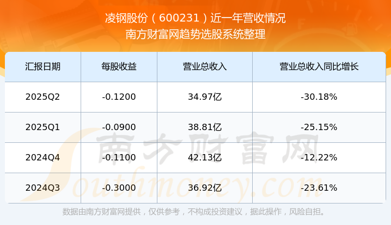 凌钢股份(600231)披露2025年第二季度报告,报告期实现营收34.97亿元,同比-30.18%;归母净利润-3.26亿元,同比-61.19%;扣非净利润-3.24亿元,同比-56.36%;基本每股收益-0.12元。
