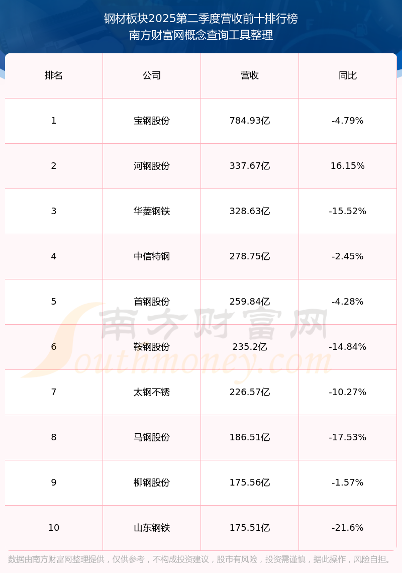 按照南方财富网概念查询工具统计,该股所属板块为钢材板块,该板块共有30只股票,凌钢股份2025第二季度营收在该板块中排名为第21名,该板块2025第二季度营收排名前十的股票如下表:
