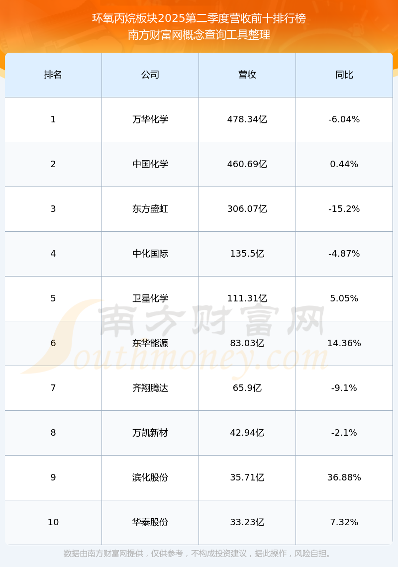 按照南方财富网概念查询工具统计,该股所属板块为环氧丙烷板块,该板块共有32只股票,滨化股份2025第二季度营收在该板块中排名为第9名,该板块2025第二季度营收排名前十的股票如下表: