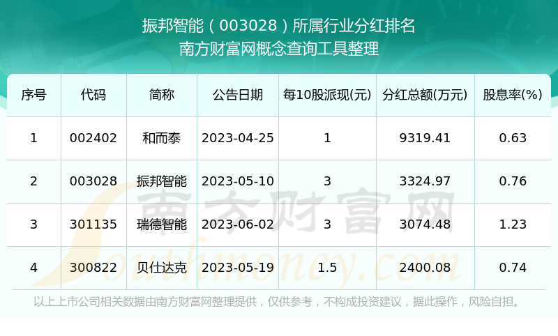 按照南方财富网趋势选股系统统计,振邦智能所属行业为智能控制器行业,智能控制器行业分红排名情况如下表: